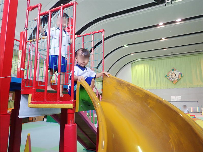 長~いすべり台に上がって、少し緊張した表情で下りてきますが、
